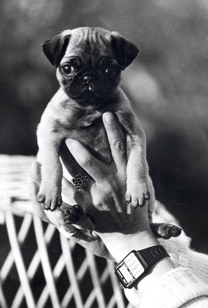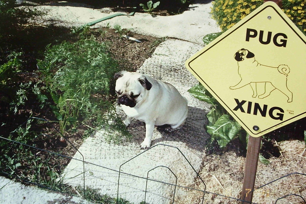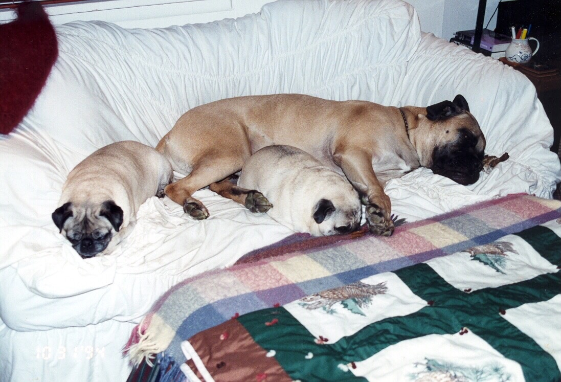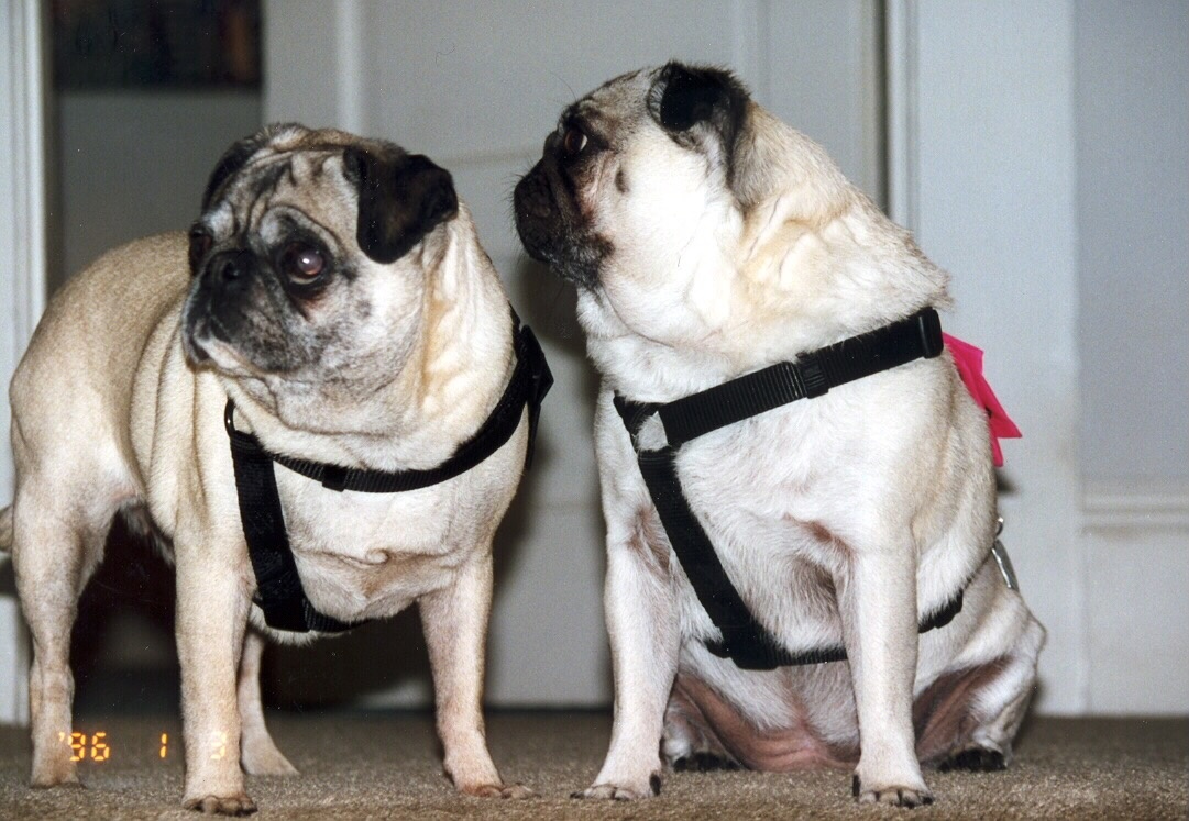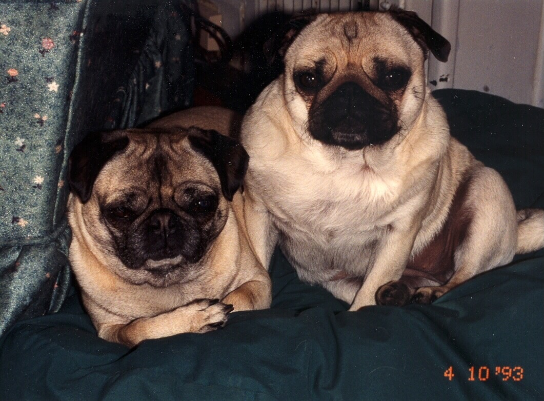 Sophia was discovered in a pet store in Buffalo by my sister, when she was visiting me and Charlene! We were shopping in a nearby store, and CR came to get me and Charlene to come see this adorable pug in the store. And of course the adorable pug came to live with us. She was one of the most entertaining dogs ever – when Charlene and I were trying to decide on her name, we ended up naming her Sophia, So Funny, So Fine! She moved with us from Buffalo to Denver, and we decided that she needed a sister, so we found a pug breeder in Montana and fetched Cozie to come live with us. They were inseparable buddies from the very start!